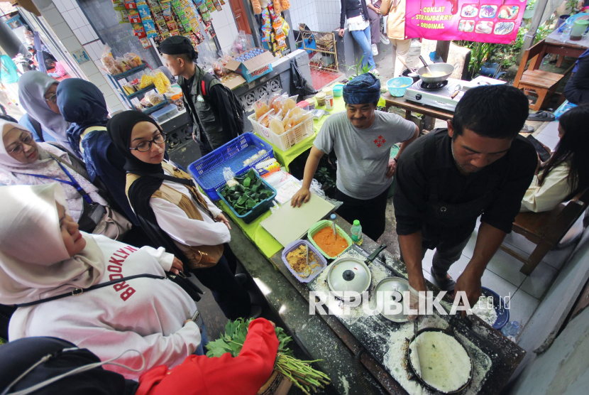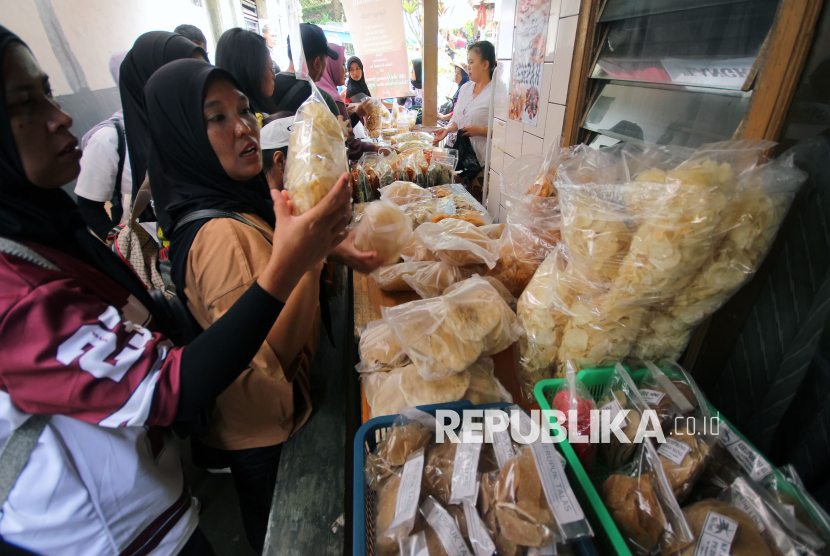 Pengunjung membeli kuliner tradisional berbahan singkong pada Festival Cireundeu 2025, di kampung adat Cireundeu di Cimahi, Sabtu (15/11/2025). Kegiatan tahunan ini merupakan upaya pelestarian seni budaya tradisi dan diversifikasi pangan khususnya panganan berbahan singkong. (FOTO : Edi Yusuf)