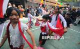 Anak-anak menari mendampingi para pejabat dan undangan menuju kampung adat Cireundeu pada Festival Cireundeu 2025, di Cimahi, Sabtu (15/11/2025). Kegiatan tahunan ini merupakan upaya pelestarian seni budaya tradisi dan diversifikasi pangan khususnya berbahan singkong. (FOTO : Edi Yusuf)