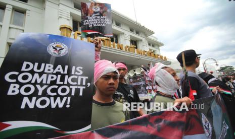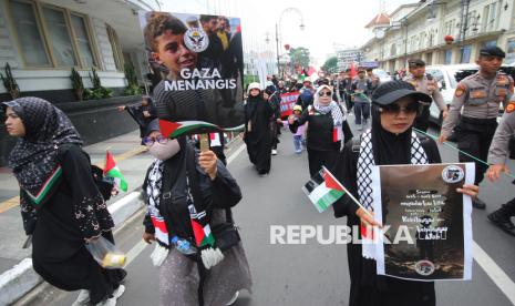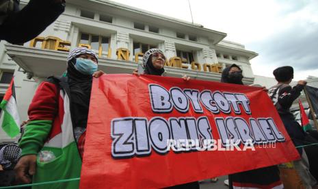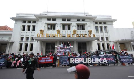 REPUBLIKA.CO.ID, BANDUNG -- Ratusan massa mengikuti aksi solidaritas Palestina yang digelar Aliansi Bela Palestina Boikot Israel (Ababil), di depan Gedung Merdeka, Kota Bandung, Ahad (16/11/2025).