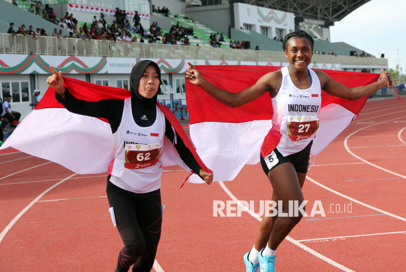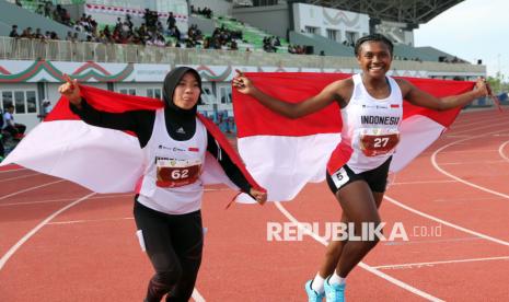 Atlet lari putri Indonesia Shava Warangga (kiri) bersama Danselina Tauru (kanan) melakukan selebrasi usai juara pada nomor lari 100 meter dalam Kejuaraan Atletik Asia Tengara 2025 di Stadion Madya Atletik, Deli Serdang, Sumatera Utara, Ahad (16/11/2025). Shava Warangga berhasil meraih medali emas dengan waktu 12.19 detik dan Danselina Tauru meraih medali perunggu dengan waktu 12.38 detik. (FOTO : ANTARA FOTO/Yudi Manar)