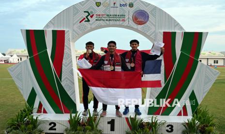 Atlet lari putra Indonesia Akbar Jabaludin (tengah) bersama Achmad Febrian (kiri) dan atlet lari Thailand Phattarakorn Insaeng (kanan) berpose usai meraih medali pada nomor lari 100 meter dalam kejuaraan Atletik Asia Tengara 2025 di Stadion Madya Atletik, Deli Serdang, Sumatera Utara, Ahad (16/11/2025). Akbar Jabaludin berhasil meraih medali emas dengan waktu 10.42 detik sedangkan Achmad Febrian meraih perak dengan waktu 10.52 detik. (FOTO : ANTARA FOTO/Yudi Manar)