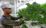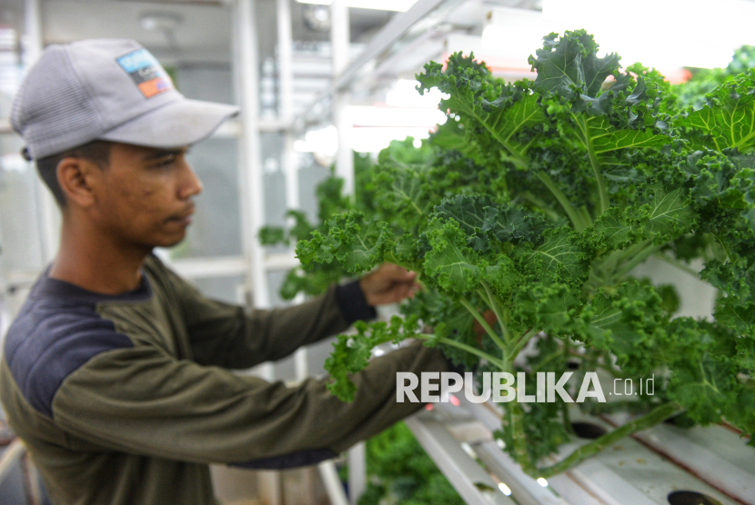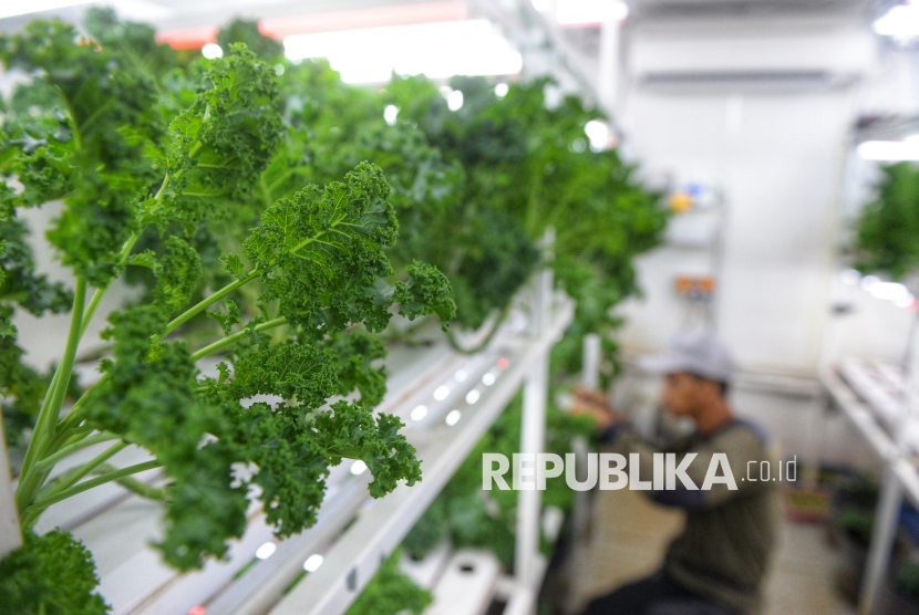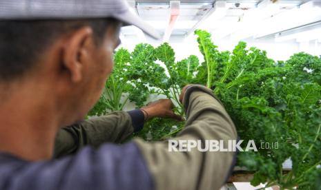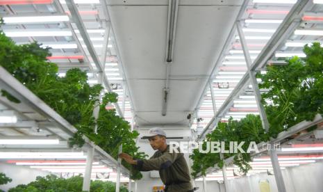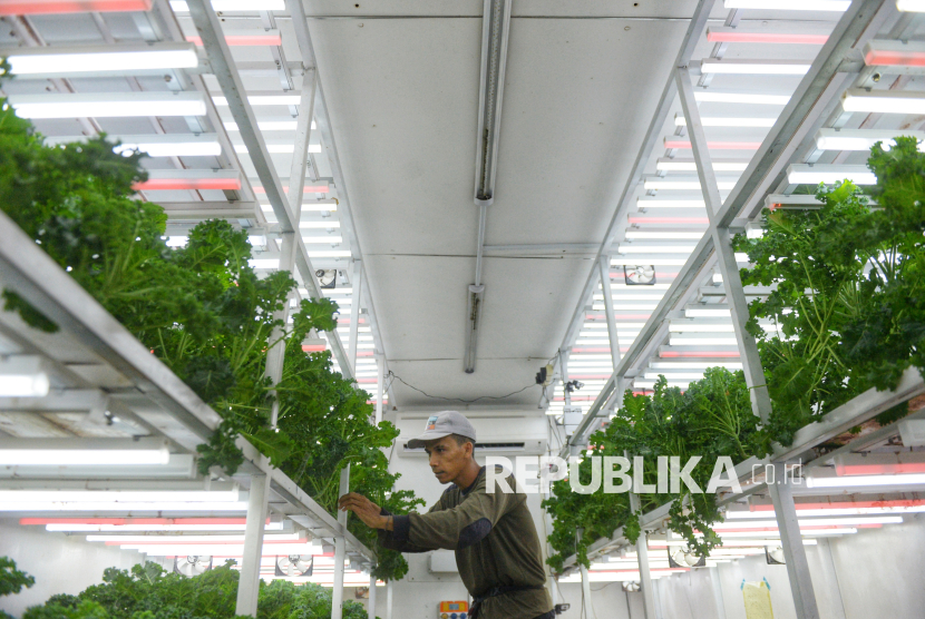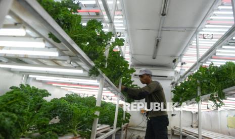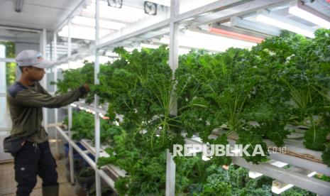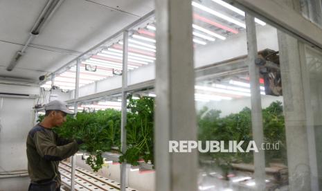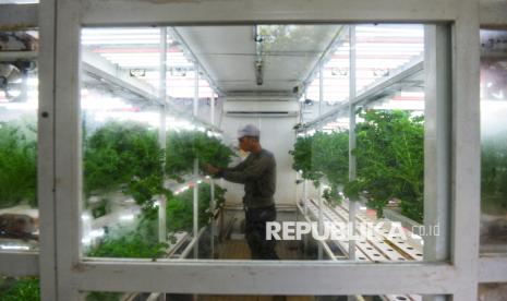 Petugas merawat tanaman yang dibudidayakan dengan metode container farming di Agro Edukasi Wisata (AEW) Ragunan, Jakarta. Container Farm di AEW Ragunan berfungsi sebagai fasilitas edukasi dan produksi sayuran modern dengan teknologi otomatis, seperti lampu UV dan sistem pendingin, sebagai solusi keterbatasan lahan kota serta upaya meningkatkan ketahanan pangan dan kualitas hasil panen. (FOTO : Republika/Prayogi)