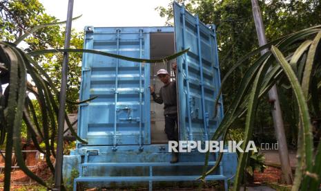 Petugas usai merawat tanaman yang dibudidayakan dengan metode container farming di Agro Edukasi Wisata (AEW) Ragunan, Jakarta. Container farming merupakan metode pertanian inovatif yang memanfaatkan kontainer pengiriman bekas yang dimodifikasi menjadi unit pertanian dalam ruang, dilengkapi sistem hidroponik, pencahayaan dan kontrol iklim untuk menanam tanaman sepanjang tahun di ruang terbatas, khususnya di perkotaan. (FOTO : Republika/Prayogi)