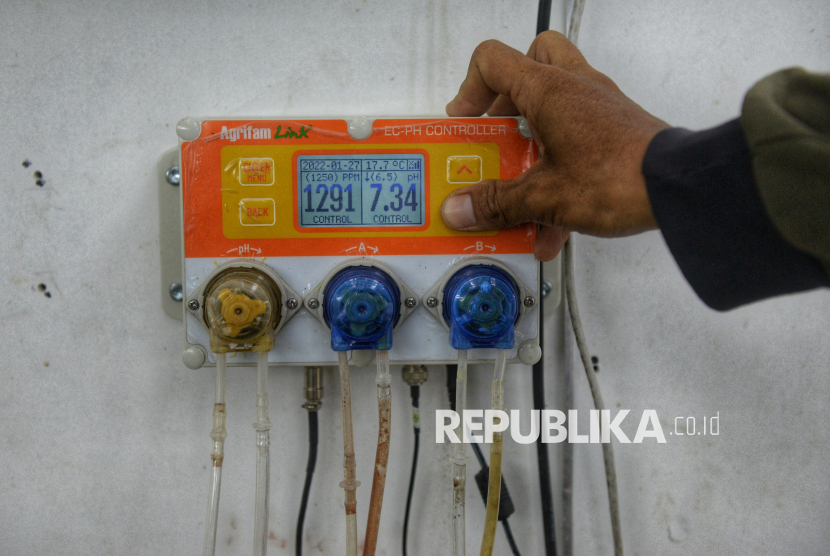 Petugas mengkontrol PH dan nutrisi tanaman yang dibudidayakan dengan metode container farming di Agro Edukasi Wisata (AEW) Ragunan. Container farming dilengkapi sistem hidroponik, pencahayaan dan kontrol iklim untuk menanam tanaman sepanjang tahun di ruang terbatas. (FOTO : Republika/Prayogi)