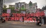 REPUBLIKA.CO.ID, SEMARANG -- Sejumlah perwakilan petani, mahasiswa, masyarakat sipil, dan aktivis lingkungan yang tergabung dalam Persatuan Gerakan Rakyat Tani (Pager Tani) Jateng membawa atribut saat aksi damai Jateng Lumbung Kriminalisasi di depan Mapolda Jateng, Semarang, Jawa Tengah, Senin (17/11/2025).