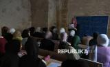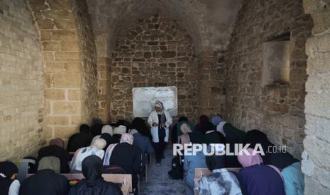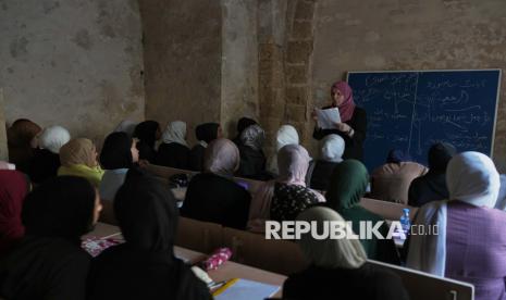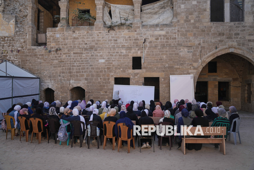 Siswa sekolah menengah Palestina mengikuti pembelajaran di Sekolah Kamilia di Kota Gaza. Sistem pendidikan di Gaza menghadapi kondisi yang sulit. Sebanyak 144 sekolah di Gaza hancur total terkena serangan Israel. Sebagian bangunan sekolah yang masih ada berubah menjadi tempat penampungan bagi pengungsi. (FOTO : AP Photo/Jehad Alshrafi)