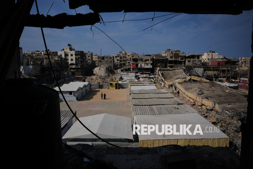 Penampakan bangunan sekolah yang hancur di Khan Younis, Gaza. UNRWA mencatat sekitar 88 persen sekolah di Gaza membutuhkan perbaikan secara menyeluruh. (FOTO : AP Photo/Abdel Kareem Hana)