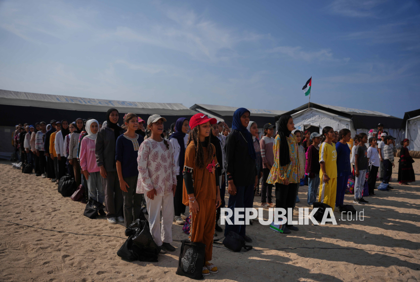 Siswa Palestina berbaris untuk mengikuti pelajaran di sekolah darurat di Khan Younis, Jalur Gaza. Ini menjadi titik awal dimulainya proses pendidikan di Gaza setelah sebelumnya terhenti total akibat perang. (FOTO : AP Photo/Abdel Kareem Hana)