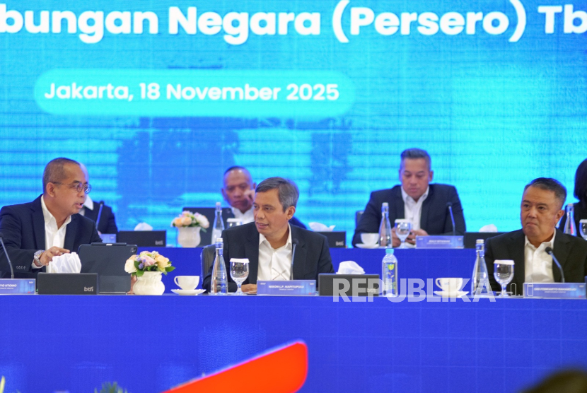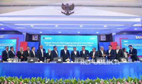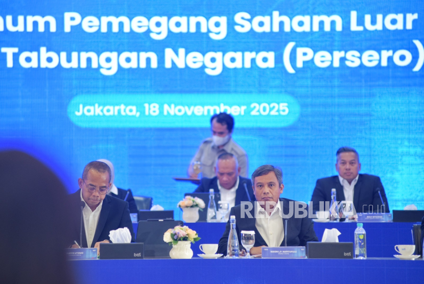 REPUBLIKA.CO.ID, JAKARTA -- Direktur Utama PT Bank Tabungan Negara (Persero) Tbk (BTN) Nixon LP Napitupulu bersama jajaran direksi dan komisaris BTN dalam Rapat Umum Pemegang Saham Luar Biasa (RUPSLB) BTN di Menara I BTN, Jakarta, Selasa (18/11/2025).
