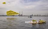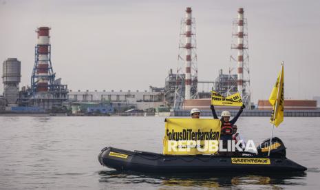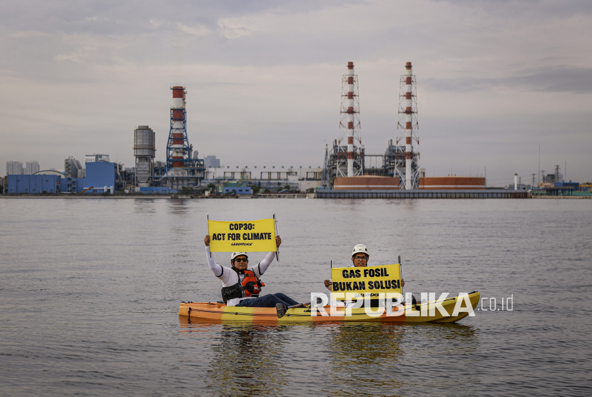 REPUBLIKA.CO.ID, JAKARTA -- Aktivis Greenpeace membentangkan spanduk saat menggelar aksi damai di kawasan Pembangkit Listrik Tenaga Gas Uap (PLTGU) Muara Karang di Jakarta, Selasa (18/11/2025).