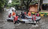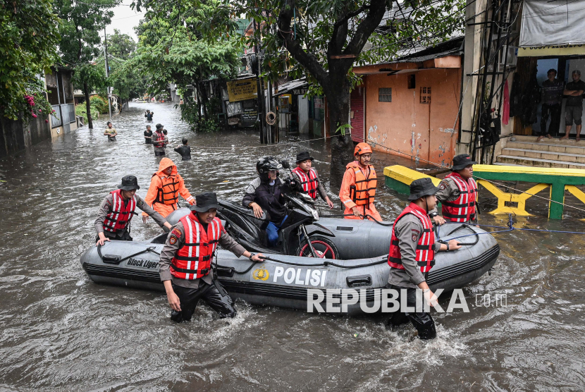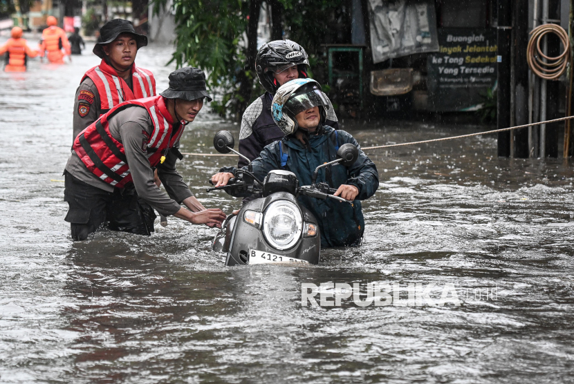 REPUBLIKA.CO.ID, JAKARTA -- Personel polisi membantu warga mengevakuasi sepeda motor saat banjir di Komplek Polri Pondok Karya, Mampang Prapatan, Jakarta, Selasa (18/11/2025).