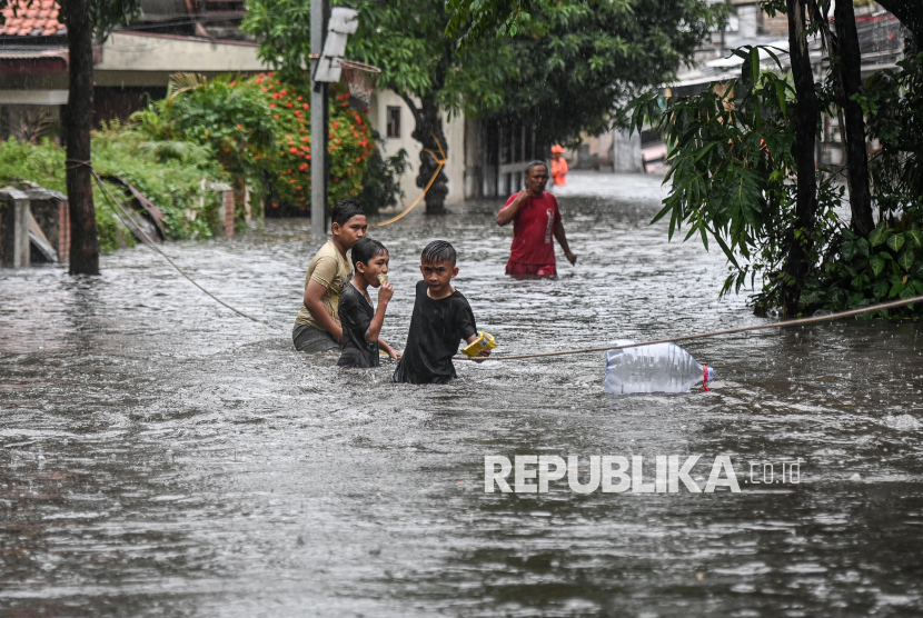 Sejumlah anak bermain saat banjir di Komplek Polri Pondok Karya, Mampang Prapatan, Jakarta, Selasa (18/11/2025). Badan Penanggulangan Bencana Daerah DKI Jakarta mencatat terdapat 13 RT di Jakarta Selatan yang tergenang banjir dengan ketinggian 30-80 centimeter akibat luapan air kali sebagai dampak dari tingginya intensitas hujan. (FOTO : ANTARA FOTO/Sulthony Hasanuddin)