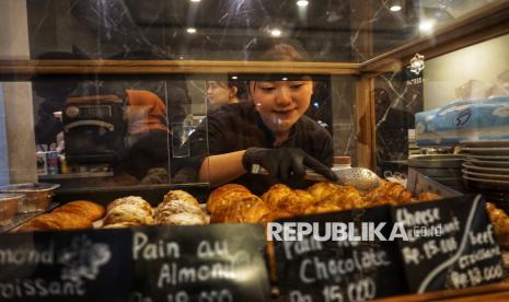 Siswa SMK PGRI 2 Kudus menata roti yang dijual di Jiva Bestari, Kudus, Jawa Tengah, Selasa (18/11/2025). Siswa tidak hanya diajarkan memasak, tetapi juga dilatih menguasai keterampilan yang dibutuhkan industri kuliner. (FOTO : Republika/Prayogi)