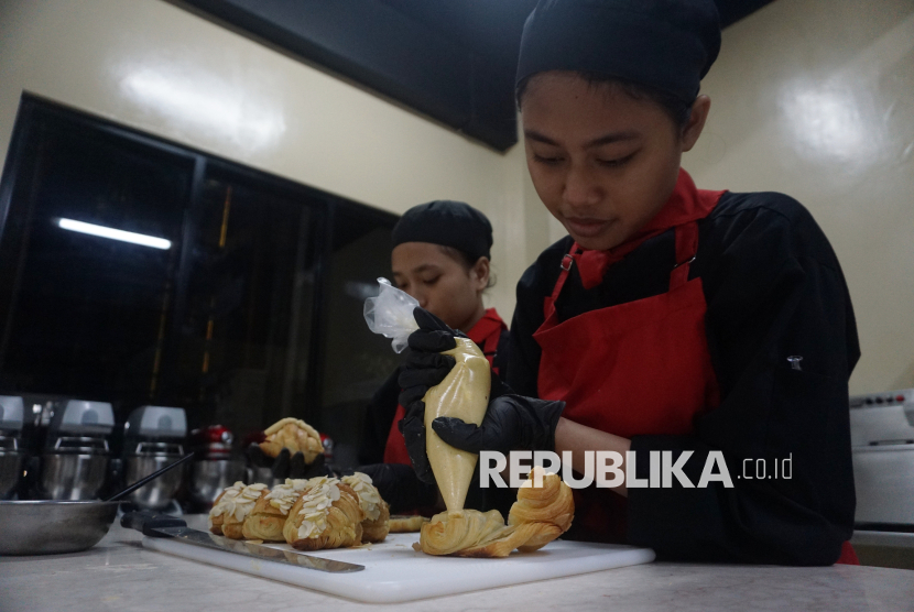 Siswa SMK PGRI 2 Kudus menyelesaikan pembuatan roti di Jiva Bestari, Kudus, Jawa Tengah, Selasa (18/11/2025). Siswa tidak hanya diajarkan memasak, tetapi juga dilatih menguasai keterampilan yang dibutuhkan industri kuliner. (FOTO : Republika/Prayogi)