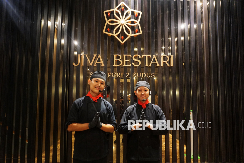 Siswa SMK PGRI 2 Kudus menyapa tamu di Jiva Bestari, Kudus, Jawa Tengah, Selasa (18/11/2025). Jiva Bestari dikelola langsung oleh siswa dengan kemampuan setara industri melalui konsep pembelajaran yang memungkinkan para siswa mempraktikkan keterampilan secara langsung kepada konsumen. (FOTO : Republika/Prayogi)