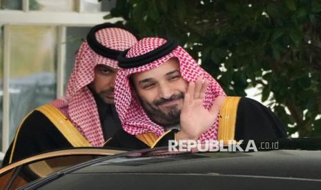 Putra Mahkota Arab Saudi Mohammed bin Salman melambaikan tangan saat akan meninggalkan Gedung Putih, Washington, Selasa (18/11/2025) waktu setempat. Kedatangan Pangeran Mohammed bin Salman di Gedung Putih disambut dengan upacara yang menampilkan marching band, pasukan berkuda pembawa bendera, dan parade militer. Kedua pemimpin berbicara tentang peluang bisnis, perdamaian, kecerdasan buatan, dan bisnis teknologi. (FOTO : AP Photo/Mark Schiefelbein)