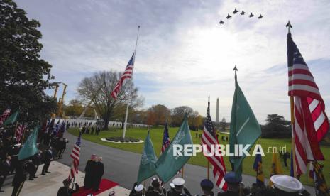 Jet Angkatan Udara AS terbang di atas Gedung Putih saat Presiden Donald Trump menyambut Putra Mahkota Arab Saudi Mohammed bin Salman di Washington, Selasa (18/11/2025) waktu setempat. Kedatangan Pangeran Mohammed bin Salman di Gedung Putih disambut dengan upacara yang menampilkan marching band, pasukan berkuda pembawa bendera, dan parade militer. (FOTO : AP Photo/Alex Brandon)