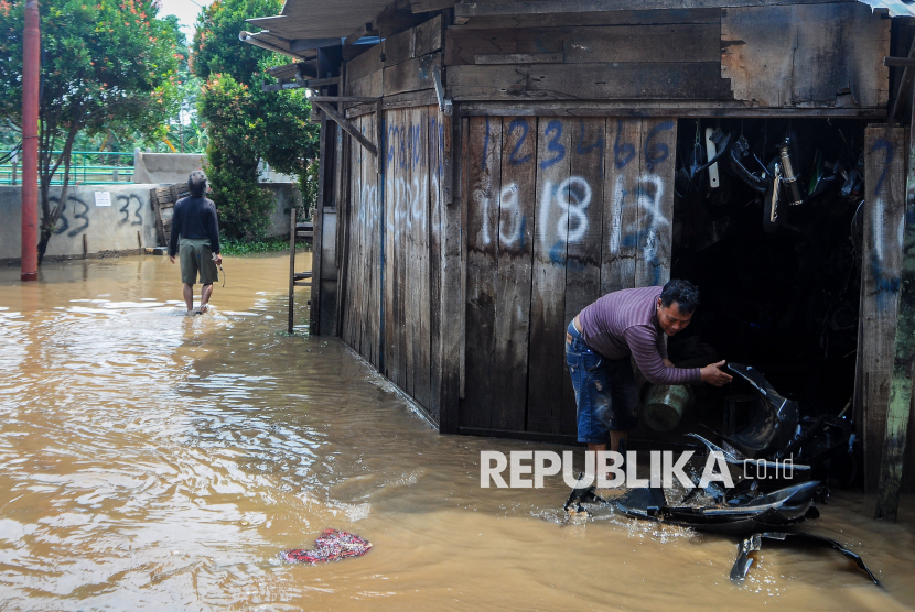 REPUBLIKA.CO.ID, JAKARTA -- Warga membantu pengendara sepeda motor yang mogok saat menerobos banjir di Jembatan Polor, Kembangan Selatan, Jakarta, Rabu (19/11/2025).