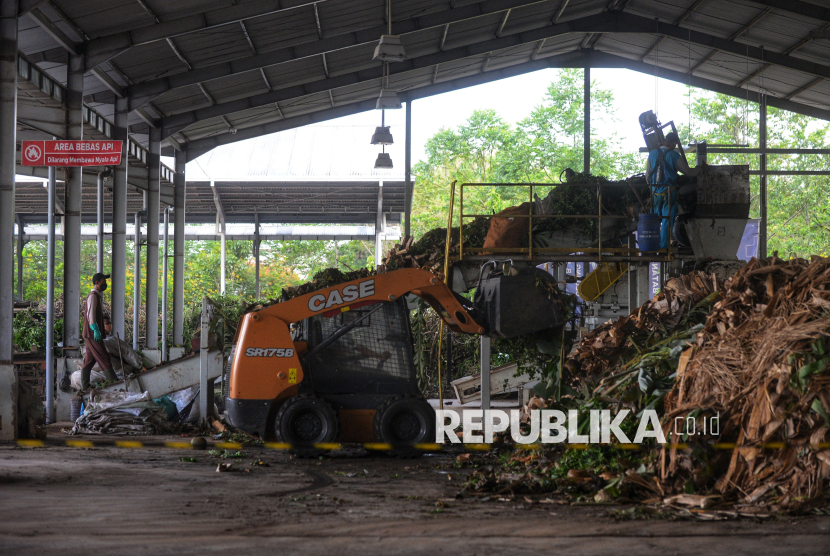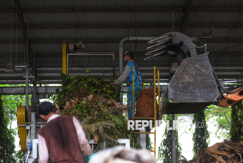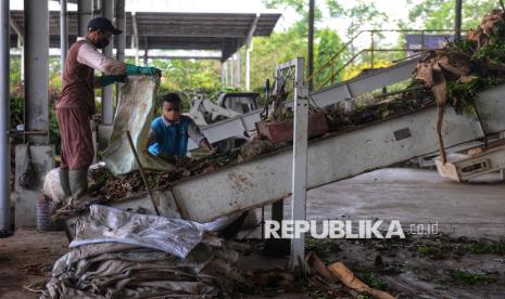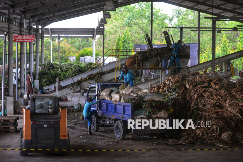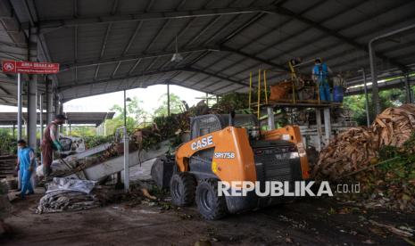 Pekerja melakukan proses pengolahan sampah organik di Pusat Pengelolaan Organik di Kawasan Djarum Oasis Kretek Factory, Kudus, Jawa Tengah, Rabu (19/11/2025). Sampah organik berasal dari katering, rumah makan, hotel, fasilitas kesehatan dan pendidikan, panti asuhan, pondok pesantren, pasar tradisional, serta masyarakat di Kudus. (FOTO : Republika/Prayogi)