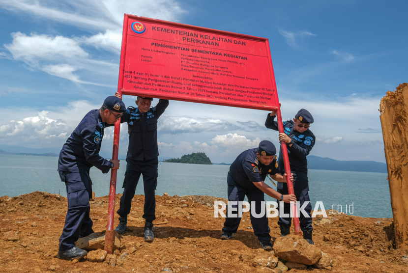 REPUBLIKA.CO.ID, KONAWE -- Sejumlah personel Polisi Khusus Pengelolaan Pesisir dan Pulau-pulau Kecil (Polsus PWP3K) Ditjen PSDKP memasang papan penghentian sementara aktivitas pemanfaatan ruang laut oleh PT. Dwimitra Multiguna Sejahtera seluas 5,8 hektare di Kecamatan Lasolo, Kabupaten Konawe Utara, Sulawesi Tenggara, Rabu (19/11/2025).