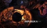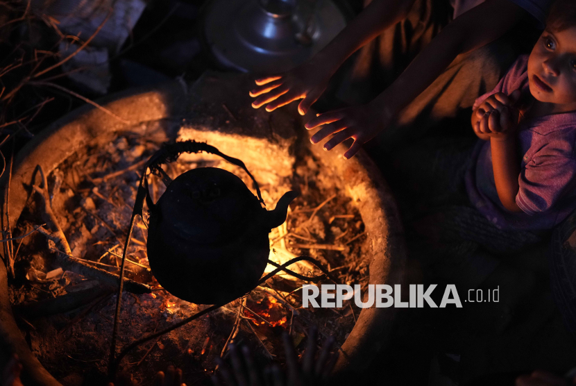 Hana Abu Mashi, 3 tahun, menghangatkan diri di dekat api unggun saat ia duduk bersama ibunya di tenda mereka di kamp darurat untuk warga Palestina di Gaza, Selasa (18/11/2025). Anak-anak Gaza hidup dengan kondisi memprihatikan di tenda-tenda pengungsian. (FOTO : AP Photo/Abdel Kareem Hana)