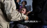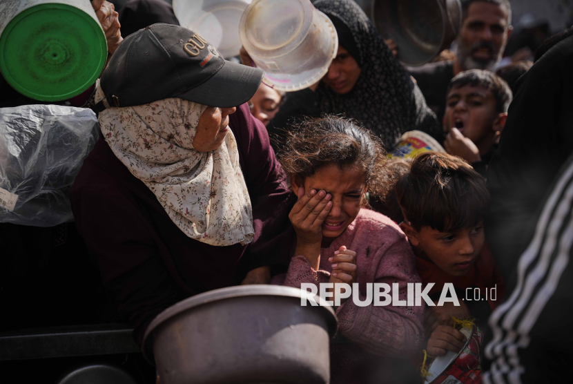 Seorang anak perempuan Gaza menangis saat berjuang mendapatkan makanan di dapur umum di Nuseirat, Jalur Gaza tengah, Rabu (19/11/2025). Ancaman kelaparan masih melanda Kota Gaza dan kini menyebar ke wilayah selatan, tempat anak-anak sudah hidup dalam kondisi yang sangat memprihatinkan. (FOTO : AP Photo/Abdel Kareem Hana)