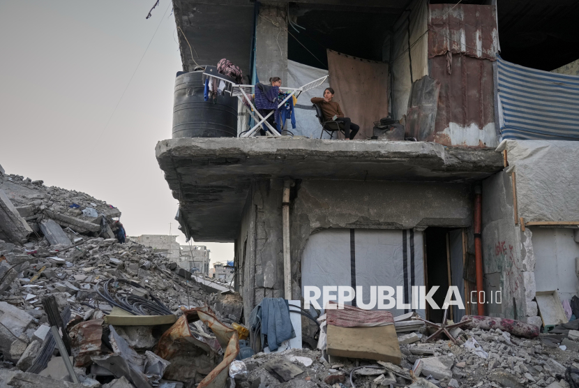 Anak Gaza duduk di sebuah gedung apartemen yang hancur akibat serangan Israel di Kota Gaza, Selasa (18/11/2025). (FOTO : AP Photo/Jehad Alshrafi)