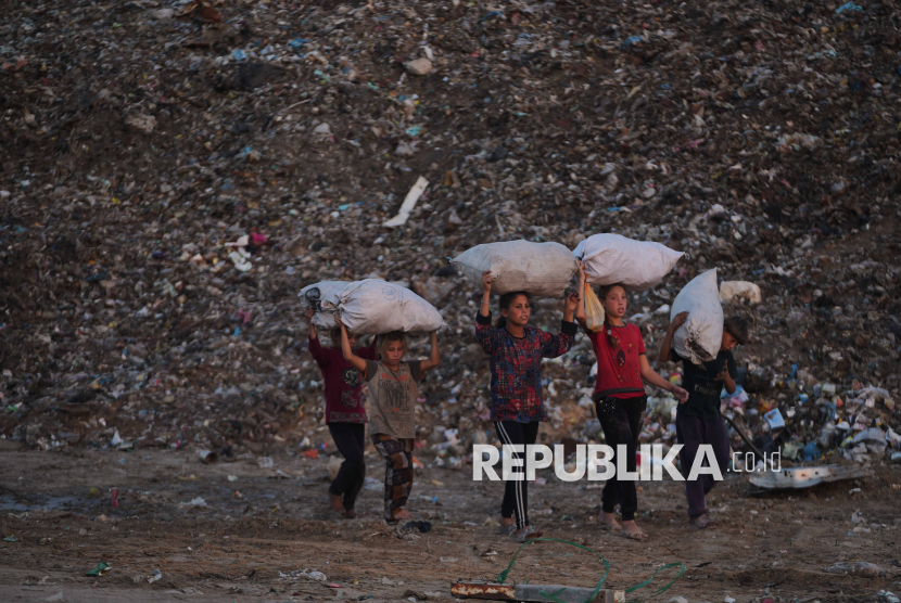 Anak-anak Palestina membawa kayu, plastik, dan kaleng dari tempat pembuangan sampah di Zawayda, Gaza, Selasa (18/11/2025). Hari Anak Sedunia seharusnya menjadi hari penuh tawa, warna, dan harapan. Namun bagi banyak anak di Gaza, hari itu kembali datang sebagai pengingat betapa jauh mereka dari rasa aman yang layak mereka miliki. (FOTO : AP Photo/Abdel Kareem Hana)