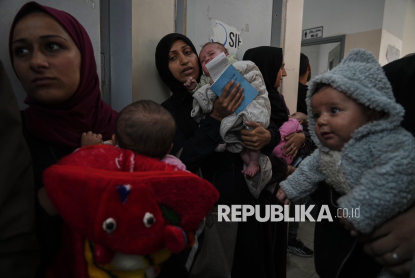 Para wanita Palestina menunggu untuk menerima vaksinasi bagi anak-anak mereka di sebuah pusat kesehatan di Kota Gaza, Ahad (9/11/2025). Krisis gizi di Gaza, terutama pada bayi, masih sangat mengkhawatirkan. Berbulan-bulan tanpa akses makanan yang layak telah menyebabkan dampak serius terhadap pertumbuhan dan perkembangan anak-anak. (FOTO : AP Photo/Jehad Alshrafi)