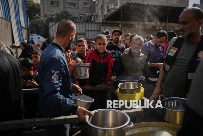 Anak-anak Palestina berjuang mendapatkan makanan di dapur umum di Nuseirat, Jalur Gaza tengah, Rabu (19/11/2025). Berbulan-bulan tanpa akses makanan yang layak telah menyebabkan dampak serius terhadap pertumbuhan dan perkembangan anak-anak. (FOTO : AP Photo/Abdel Kareem Hana)