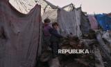 Anak-anak Palestina berdiri di depan tenda di kamp darurat untuk para pengungsi di Zawayda, Jalur Gaza, Selasa (18/11/2025). Selama lebih dari 700 hari, anak-anak di Gaza telah syahid, terluka, dan terpaksa mengungsi akibat perang. (FOTO : AP Photo/Abdel Kareem Hana)