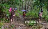 Sejumlah siswa SD Negeri 2 Sorongan berjalan melintasi hutan usai pulang sekolah di Desa Sorongan, Pandeglang, Banten, Kamis (20/11/2025). Siswa dan guru di daerah tersebut harus menempuh perjalanan sepanjang sekitar tiga hingga empat kilometer dari pemukiman dengan waktu tempuh mencapai satu jam akibat sulitnya medan terutama ketika musim hujan tiba. (FOTO : ANTARA FOTO/Muhammad Bagus Khoirunas)