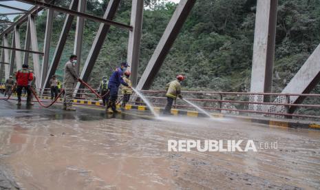 REPUBLIKA.CO.ID, LUMAJANG -- Personel pemadam kebakaran diterjunkan untuk membersihkan jalan di wilayah yang terdampak abu vulkanik erupsi Gunung Semeru di Jembatan Curah Kobokan, Lumajang, Jawa Timur, Kamis (20/11/2025).