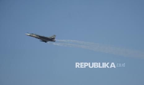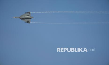 Pesawat jet HAL Tejas India melakukan atraksi udara beberapa saat sebelum jatuh di Dubai Air Show, di Bandara Internasional Al Maktoum di Dubai World Central, Dubai, Uni Emirat Arab, Jumat (21/11/2025). Jet tempur produksi India jatuh pada hari terakhir Dubai Airshow 2025 hingga menewaskan sang pilot. (FOTO : AP Photo/Jon Gambrell)