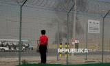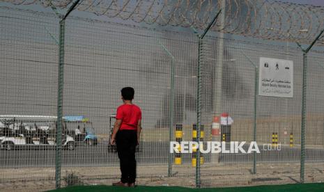 Seorang warga menyaksikan pesawat jet HAL Tejas India yang jatuh saat melakukan demonstrasi udara di Dubai Air Show, di Bandara Internasional Al Maktoum di Dubai World Central, Dubai, Uni Emirat Arab, Jumat (21/11/2025). Jet tempur produksi India jatuh pada hari terakhir Dubai Airshow 2025 hingga menewaskan sang pilot. Foto-foto dari lokasi kejadian pada Jumat (21/11/2025) sore waktu setempat, menunjukkan kepulan asap di sisi terjauh lapangan terbang di Bandara Internasional Al Maktoum. (FOTO : AP Photo/Jon Gambrell)