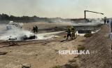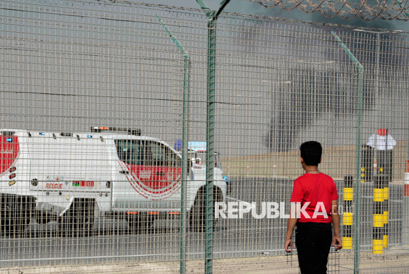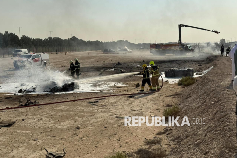REPUBLIKA.CO.ID, DUBAI -- Petugas melakukan pendinginan di lokasi jatuhnya pesawat jet HAL Tejas India di Dubai Air Show, di Bandara Internasional Al Maktoum di Dubai World Central, Dubai, Uni Emirat Arab, Jumat (21/11/2025).