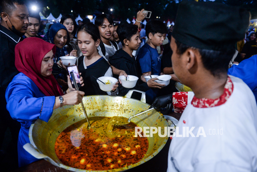 REPUBLIKA.CO.ID, TANGERANG -- Warga antre untuk mendapatkan hidangan laksa saat masak dan makan besar seribu porsi laksa di Alun-alun Ahmad Yani, Kota Tangerang, Banten, Sabtu (22/11/2025). Kegiatan memasak sebanyak seribu porsi laksa yang dibagikan gratis kepada warga tersebut untuk mempromosikan dan melestarikan kuliner khas Kota Tangerang yang termasuk dalam warisan budaya tak benda.