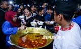 Ribuan warga tampak antusias mengikuti kegiatan Culinary Day Kota Tangerang. Mereka dengan sabar antre untuk turut mencicipi hidangan laksa yang disediakan gratis oleh pihak penyelenggara. (FOTO : ANTARA FOTO/Putra M. Akbar)