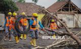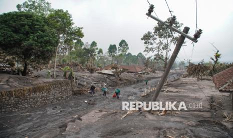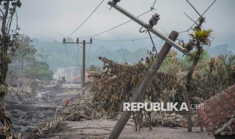 REPUBLIKA.CO.ID, LUMAJANG -- Relawan melintas di dekat tiang penyulang listrik yang rusak terdampak erupsi Gunung Semeru di Desa Supiturang, Pronojiwo, Lumajang, Jawa Timur, Ahad (23/11/2025).