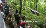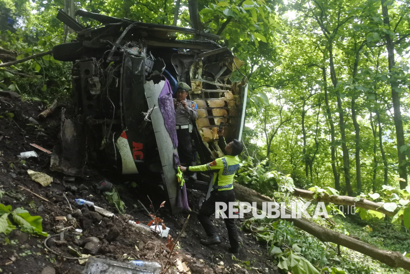 Polisi melakukan olah tempat kejadian perkara untuk mengetahui penyebab pasti kecelakaan bus penumpang yang terjun ke jurang.