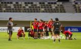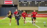 REPUBLIKA.CO.ID, SLEMAN -- Pesepak bola Timnas Putri Indonesia melakukan pemanasan saat Official Training jelang laga FIFA Women’s Match Day di Stadion Maguwoharjo, Sleman, D.I Yogyakarta, Selasa (25/11/2025).