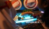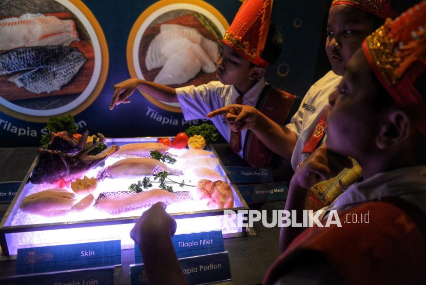 Anak sekolah dasar mengamati ikan tilapia yang dipajang pada acara Celebrate National Fish Day & Unveiling a New Culinary Experience di Jakarta, Selasa (25/11/2025). Acara yang diselenggarakan dalam rangka memperingati Hari Ikan Nasional 2025 tersebut sekaligus mengukuhkan komitmen Regal Springs Indonesia untuk memastikan ketersediaan produk ikan tilapia fillet berkualitas, serta mendukung agenda ketahanan pangan nasional melalui penyediaan protein ikan berkualitas tinggi. (FOTO : Republika/Prayogi)