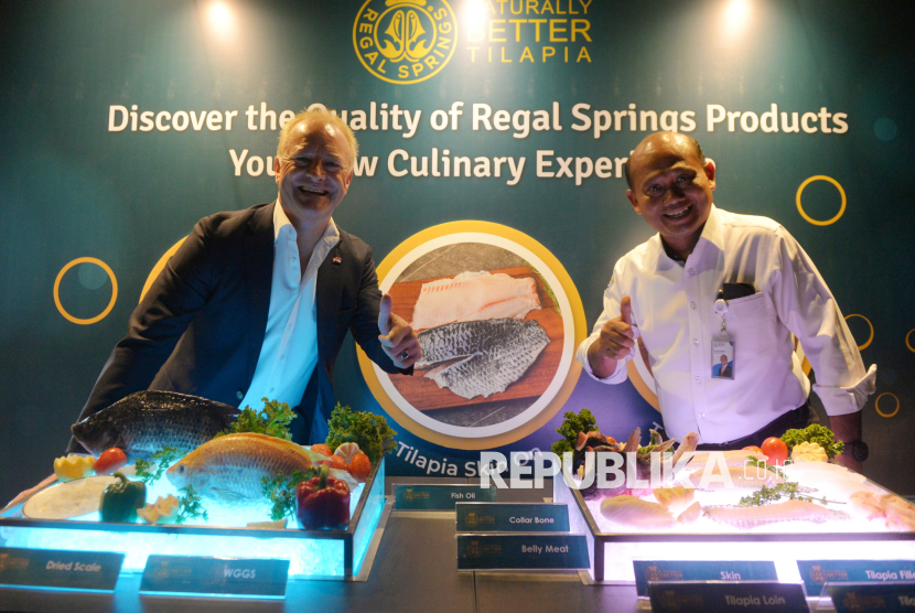 Presiden Direktur Regal Springs Indonesia Rudolf Hoeffelman berfoto bersama dengan Direktur Jenderal Perikanan Budidaya Kementerian Kelautan dan Perikanan Tb Haeru Rahayu pada acara Celebrate National Fish Day & Unveiling a New Culinary Experience di Jakarta, Selasa (25/11/2025). Acara yang diselenggarakan dalam rangka memperingati Hari Ikan Nasional 2025 tersebut sekaligus mengukuhkan komitmen Regal Springs Indonesia untuk memastikan ketersediaan produk ikan tilapia fillet berkualitas, serta mendukung agenda ketahanan pangan nasional melalui penyediaan protein ikan berkualitas tinggi. (FOTO : Republika/Prayogi)