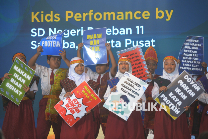 Anak sekolah dasar turut memeriahkan acara Celebrate National Fish Day & Unveiling a New Culinary Experience yang diadakan oleh Regal Springs Indonesia di Jakarta, Selasa (25/11/2025). Acara yang diselenggarakan dalam rangka memperingati Hari Ikan Nasional 2025 tersebut sekaligus mengukuhkan komitmen Regal Springs Indonesia untuk memastikan ketersediaan produk ikan tilapia fillet berkualitas, serta mendukung agenda ketahanan pangan nasional melalui penyediaan protein ikan berkualitas tinggi. (FOTO : Republika/Prayogi)