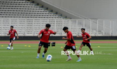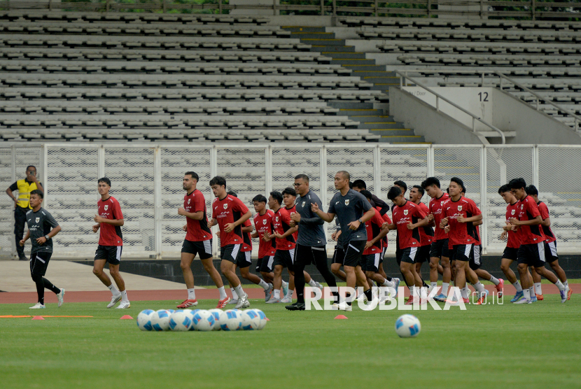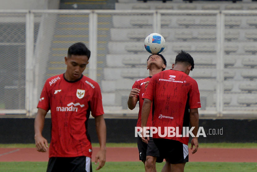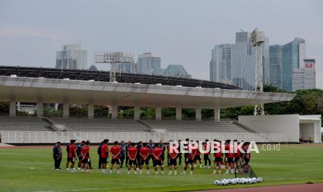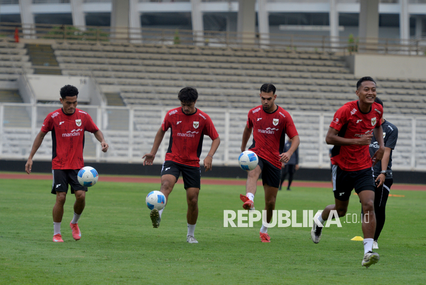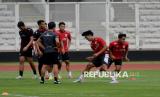Para pemain timnas Indonesia U-22 mengikuti sesi latihan di Stadion Madya, Kompleks GBK, Senayan, Jakarta, Rabu (26/11/2025). Timnas Indonesia U-22 menggelar sesi latihan intensif sebagai persiapan untuk berlaga pada ajang Sea Games 2025 di Thailand. Latihan dipimpin langsung oleh pelatih Indra Sjafri. (FOTO : Edwin Putranto/Republika)