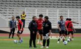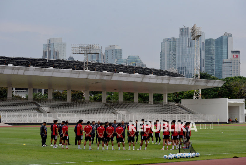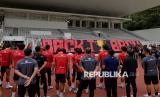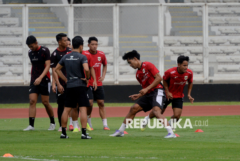 Pelatih timnas Indonesia U-22 Indra Sjafri memimpin sesi latihan timnas Indonesia U-22 di Stadion Madya, Kompleks GBK, Senayan, Jakarta, Rabu (26/11/2025). Timnas Indonesia U-22 menggelar sesi latihan intensif sebagai persiapan untuk berlaga pada ajang Sea Games 2025 di Thailand. Latihan dipimpin langsung oleh pelatih Indra Sjafri. (FOTO : Edwin Putranto/Republika)