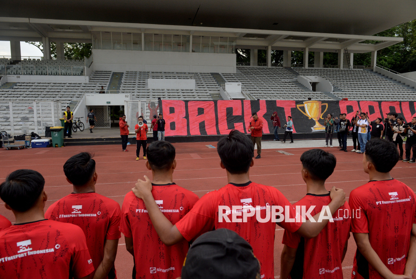 REPUBLIKA.CO.ID, JAKARTA -- Kelompok Suporter Timnas Indonesia La Grande Indonesia memberikan semangat kepada para pemain U-22 yang akan berlaga di Sea Games 2025 Thailand sebelum sesi latihan di Stadion Madya, Kompleks GBK, Senayan, Jakarta, Rabu (26/11/2025).