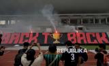 Kelompok Suporter Timnas Indonesia La Grande Indonesia memberikan semangat kepada para pemain U-22 yang akan berlaga di Sea Games 2025 Thailand sebelum sesi latihan di Stadion Madya, Kompleks GBK, Senayan, Jakarta, Rabu (26/11/2025). Para suporter hadir di sesi latihan Timnas Indonesia U-22 untuk memberikan semangat. Mereka membentangkan spanduk bertuliskan Back to Back yang dimaksudkan agar Timnas Indonesia dapat mempertahankan medali emas sepak bola di Sea Games 2025. (FOTO : Edwin Putranto/Republika)