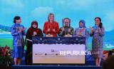 Penasihat Khusus Sekretaris Jenderal PBB untuk Kesehatan Finansial (UNSGSA) yang juga Ratu Maxima dari Kerajaan Belanda (ketiga kiri) memukul gamelan bersama Ketua Dewan Komisioner Otoritas Jasa Keuangan (OJK) Mahendra Siregar (ketiga kanan), Kepala Eksekutif Pengawas Perilaku Pelaku Usaha Jasa Keuangan, Edukasi, dan Pelindungan Konsumen OJK Friderica Widyasari Dewi (kiri), Dirjen Stabilitas dan Pengembangan Sektor Keuangan Kemenkeu Masyita Crystallin (kanan), Anggota Komisi XI DPR Andi Yuliani Paris (kedua kanan) dan Anis Byarwati (kedua kiri) usai mengikuti acara Kesehatan Finansial Nasional di Gedung Dhanapala Kemenkeu, Jakarta, Kamis, (27/11/2025). Kegiatan tersebut membahas tema Kesehatan Keuangan untuk Semua: Membangun Indonesia yang Inklusif dan Tangguh (FOTO : Republika/Thoudy Badai)