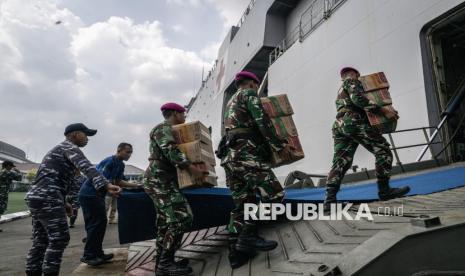 Prajurit TNI AL memuat bantuan kemanusiaan ke wilayah terdampak bencana di Kolinamil TNI AL, Jakarta, Ahad (30/11/2025). TNI AL mengerahkan KRI dr Soeharso, KRI Teluk Gilimanuk, KRI dr Radjiman Wedyodiningrat, KRI Semarang dan KRI Sutedi Senaputra yang membawa tim medis, logistik, personel penyelamat serta lima helikopter guna mendukung operasi pencarian, evakuasi dan distribusi bantuan ke Aceh, Sumatera Utara dan Sumatera Barat. (FOTO : ANTARA FOTO/Bayu Pratama S)